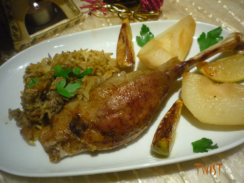 Гусь с начинкой из пряного риса, груш и инжира